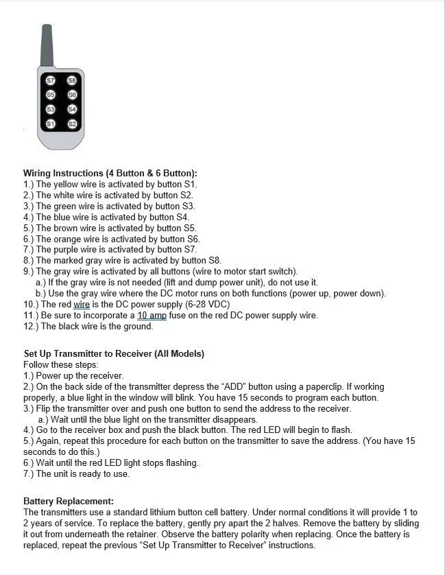 Categories: All Hydraulic Pumps Dual Acting Pumps (Power Up, POWER Down) Single Acting Pumps (Power Up, GRAVITY Down) Remotes Shop All Hydraulic Pumps Remotes D8 MTE 6 Way Pump - 1.4 Gallon FREE SHIPPING from $1,229.00 Sale Select Remote Type No Remote Wired Only 6 Button Remote Wireless Only 6 Function Remote Both Wired & Wireless Remotes Add To Cart Added! MTE 4 Way Pump FREE WIRED REMOTE 1.4 gallon poly reservoir FREE SHIPPING from $1,189.00 Sale Select Remote Options Wired Remote ONLY Plus a Wireless Remote Add To Cart Added! R6-1 000' range Wireless 2, 4, 6 or 8 Function Remote from $499.00 Sale View Options 8 Button Transmitter for 1000 foot range Wireless Remote system Sale Price: $179.00 Original Price: $195.00 Sale 4 Function 6 Function 8 Function Add To Cart Added! R8 MTE 4 Button Remote Sale Price: $159.00 Original Price: $179.00 Sale Add To Cart Added! R9 MTE 6 Button Remote FREE SHIPPING Sale Price: $189.00 Original Price: $200.00 Sale Add To Cart Added! R1 Ace 3 Wire, 2 Button Remote Sale Price: $38.95 Original Price: $46.95 Sale Add To Cart Added! Pierce Cattle Siren Wiring Kit Sale Price: $29.95 Original Price: $35.95 Sale Add To Cart Added!